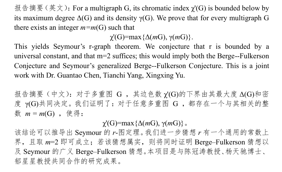 报告人简介:郝燕丽,目前是佐治亚理工的Hale Visiting Assistant Peofessor。研究方向是结构图论与图的着色。2023年在佐治亚州立大学获得数学博士学位,师从陈冠涛教授。博士期间及之后,工作主要围绕图的边着色、线性荫度猜想等相关问题展开,已在《Journal of Combinatorial Theory, Series B》和《Journal of Graph Theory》等期刊上发表多篇论文。目前,与博士后合作导师郁星星教授正在研究多重图的最优边着色问题,相关论文已投稿。