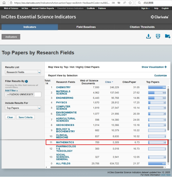 2025年11月13日,据科睿唯安最新发布的《基本科学指标数据库》(Essential Science Indicators,简称ESI)统计数据显示,我校数学学科首次进入ESI全球排名前1%行列,所处千分位为9.925‰,总被收录论文为789篇,总被引数为5309次,全球排名位居第397名,国内排名位居第83名。数学学科成为我校第13个进入ESI全球前1%的学科。